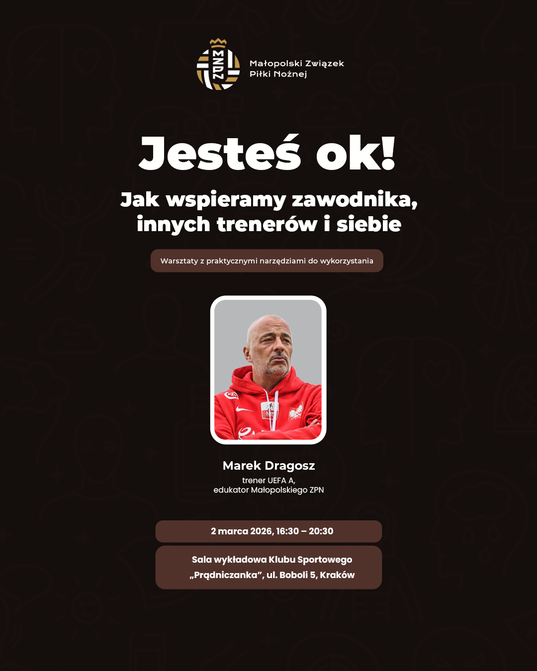 Szkolenie poprowadzi Marek Dragosz – trener UEFA A i edukator Małopolskiego ZPN, były selekcjoner reprezentacji Polski w ampfutbolu, z którą dwukrotnie sięgnął po brązowe medale Mistrzostw Europy oraz wywalczył czwarte miejsce w Mistrzostwach Świata. Jako ekspert i mówca motywacyjny dzielił się wiedzą w ponad stu krajach, a inspirację czerpał z wizyt w ponad trzydziestu topowych klubach piłkarskich Europy.