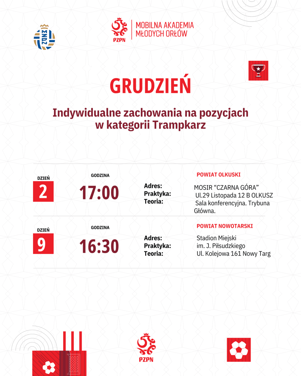 Mobilna Akademia Młodych Orłów zaprasza trenerów z Małopolski na dwa kolejne szkolenia „Indywidualne zachowania na pozycjach w kategorii trampkarz”, które odbędą się 2.12.2025 r. o g. 17:00 w Olkuszu na obiektach MOSiR „Czarna Góra” (ul. 29 listopada 12B) oraz 9.12.2025 r. o g. 16:30 w Nowym Targu na Stadionie Miejskim im. J. Piłsudzkiego (ul. Kolejowa 161).