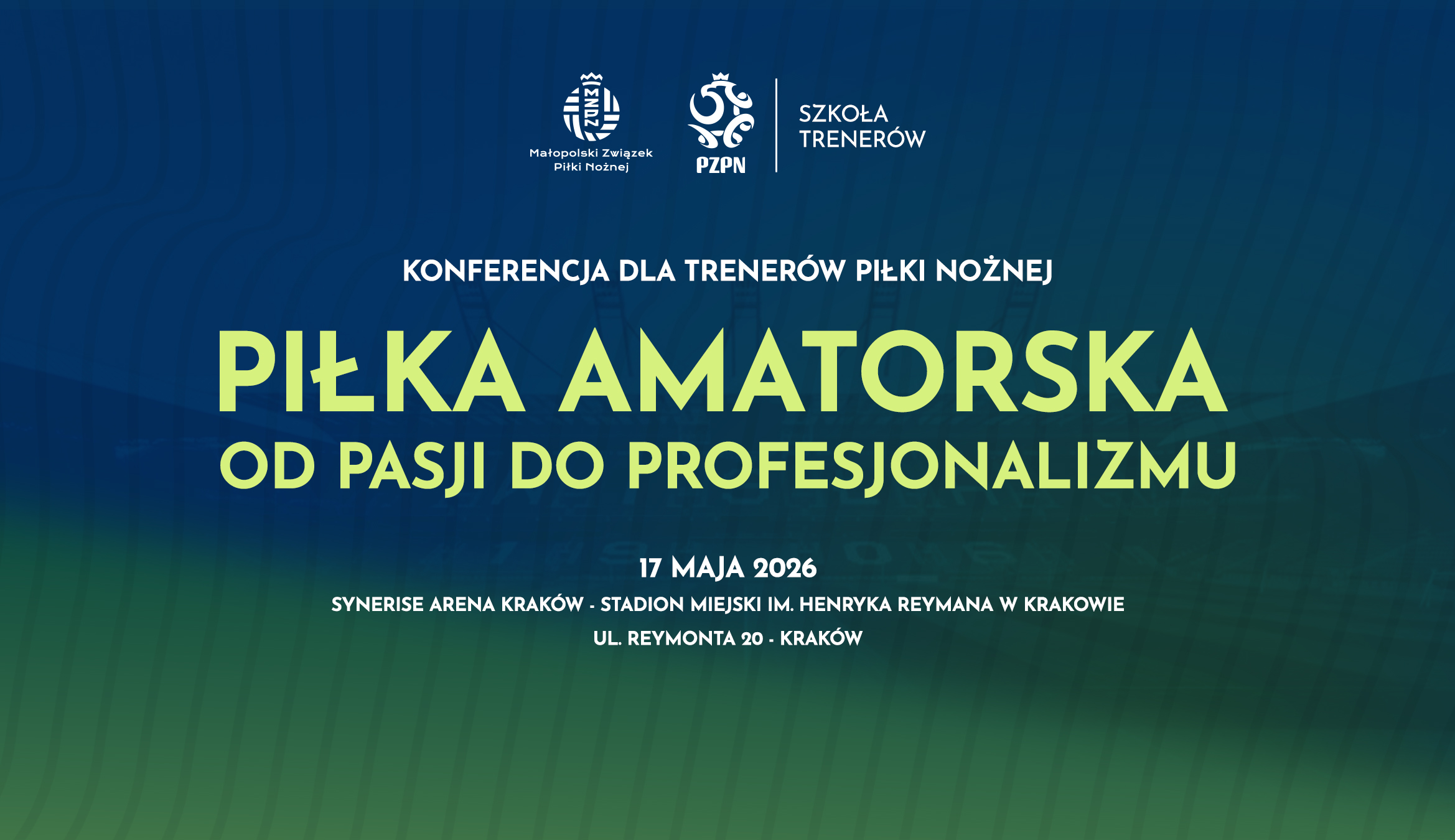 Małopolski Związek Piłki Nożnej zaprasza trenerów i trenerki na konferencję szkoleniową pn. „Piłka amatorska – od pasji do profesjonalizmu”, która odbędzie się w niedzielę 17 maja 2026 roku na Stadionie Miejskim im. Henryka Reymana w Krakowie.
