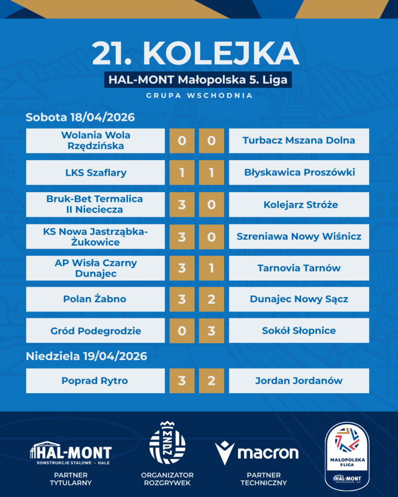 Piłkarskie emocje w HAL-MONT Małopolskiej 5. Lidze nie zwalniają tempa. 21. kolejka przyniosła kibicom wiele interesujących rozstrzygnięć, zwrotów akcji oraz wyników, które miały istotny wpływ na układ tabel zarówno w grupie wschodniej, jak i zachodniej.