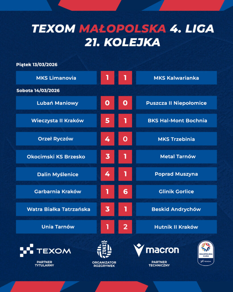 Gole padały seriami, a kilka wyników potrafiło zaskoczyć nawet uważnych obserwatorów ligi. 21. kolejka TEXOM Małopolskiej 4. Ligi przyniosła aż 35 bramek, wysokie zwycięstwa i istotne przetasowania w tabeli. Lider z Ryczowa powiększył przewagę, potknął się Beskid Andrychów, a za plecami czołówki coraz wyraźniej przyspieszają kolejne zespoły.