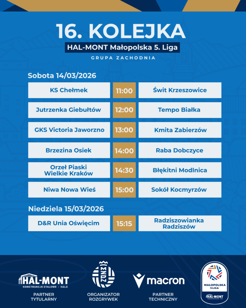 W ten weekend rozgrywki wracają wraz z 16. kolejką sezonu. W grupie zachodniej kibice zobaczą m.in. spotkanie lidera – Victoria Jaworzno podejmie Kmitę Zabierzów. Błękitni Modlnica zmierzą się na wyjeździe z Orłem Piaski Wielkie Kraków, a Niwa Nowa Wieś zagra z Sokołem Kocmyrzów.